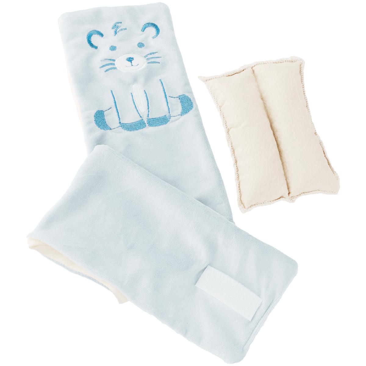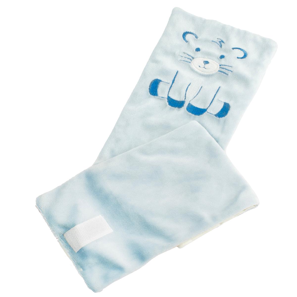 • Se estiver morna (temperatura ideal de trinta e sete graus celsius), posicionar sobre o abdômen do bebê e ajustar a faixa confortavelmente.