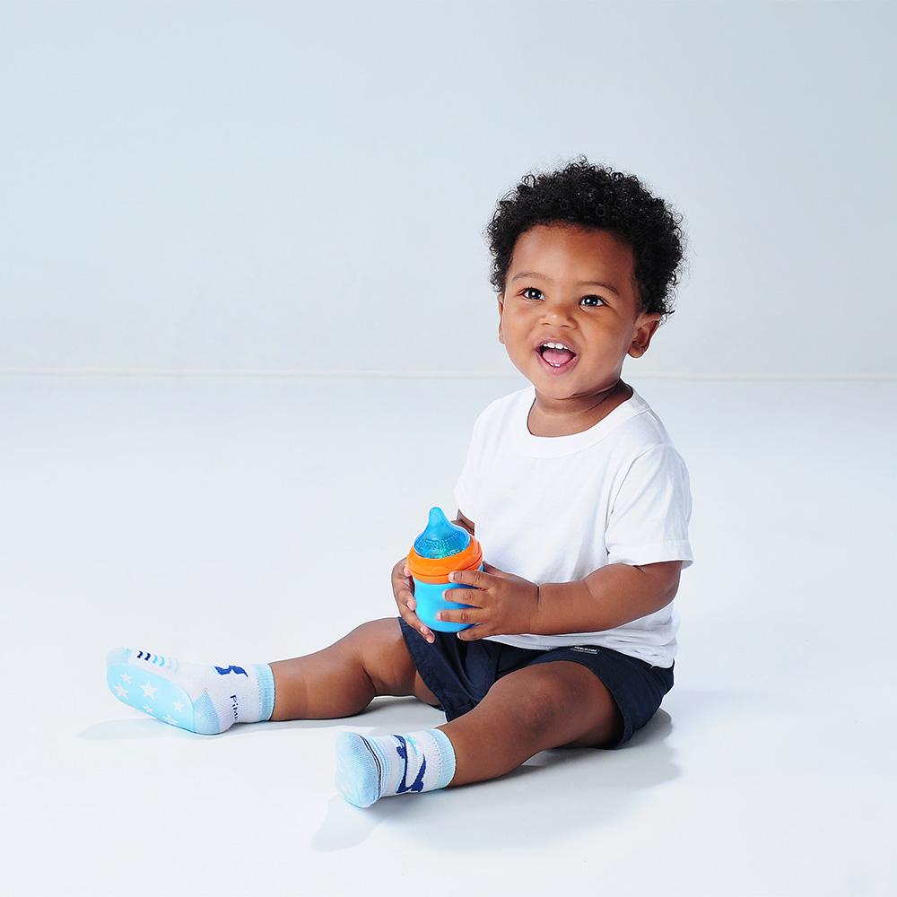 É preciso colocar pilhas 2AA antes de entregar o brinquedo para a criança. As luzes e a música são acionados ao pressionar o bico da mamadeira.