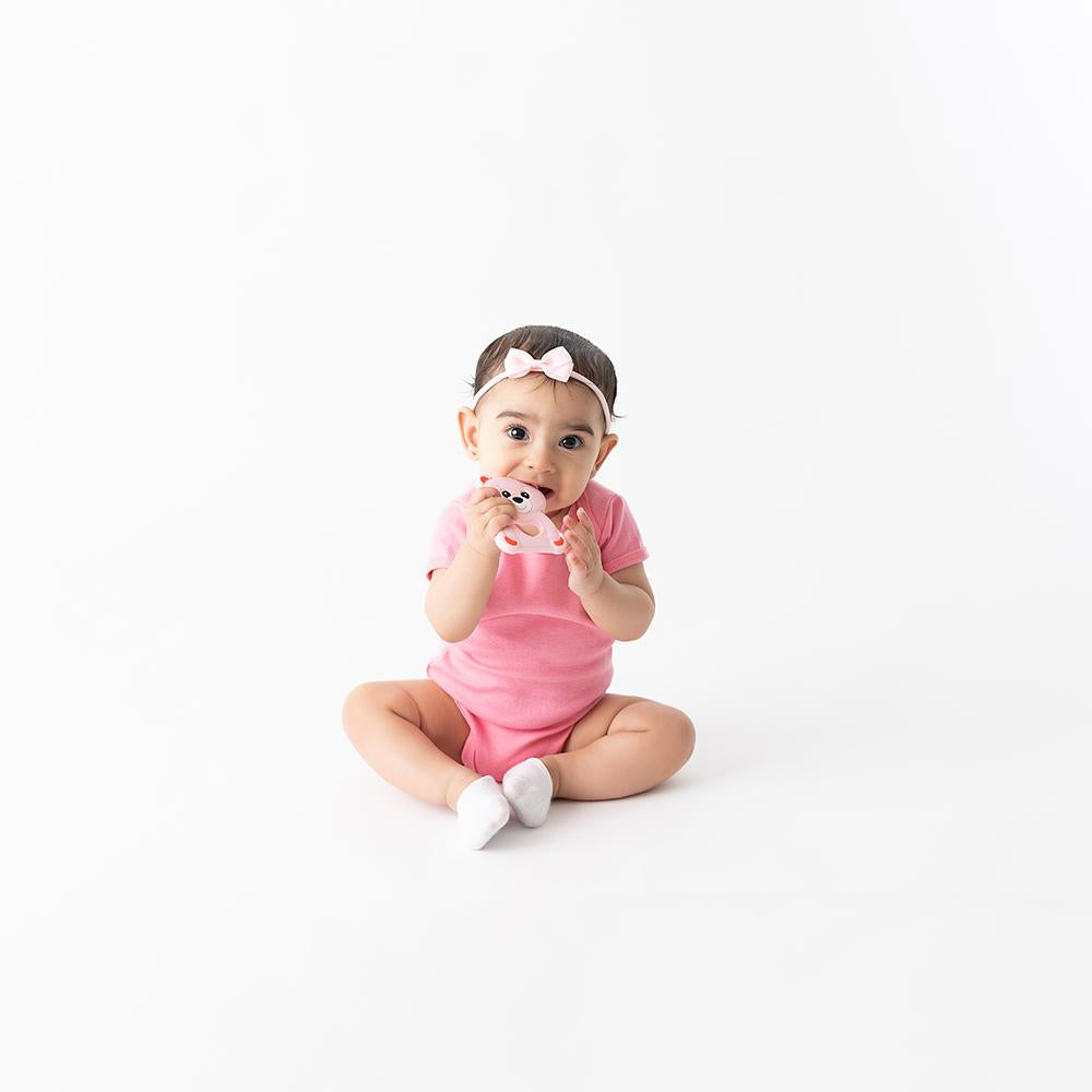 Mordedor de silicone macio, ideal para a fase de dentição do bebê. Possui diferentes texturas além de um design divertido e alegre. Contém 1 unidade.